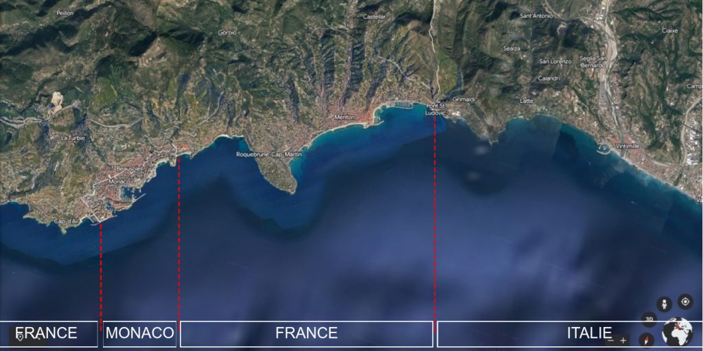 La costa mediterranea in prossimità del confine franco-italiano continentale fa parte dell’unità chiamata “Riviera”. Al cuore di questa unità, in circa dieci chilometri, si susseguono quattro città e tre Stati: Monaco (MONACO), Roquebrune-Cap-Martin e Mentone (FRANCIA), Ventimiglia (ITALIA).